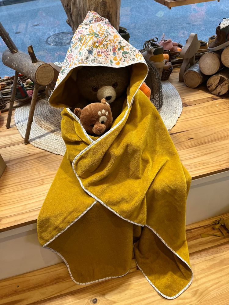 Confection en éponge bambou ou nid d’abeille et coton imprimé ou gaze de coton selon le thème choisi par les parents.