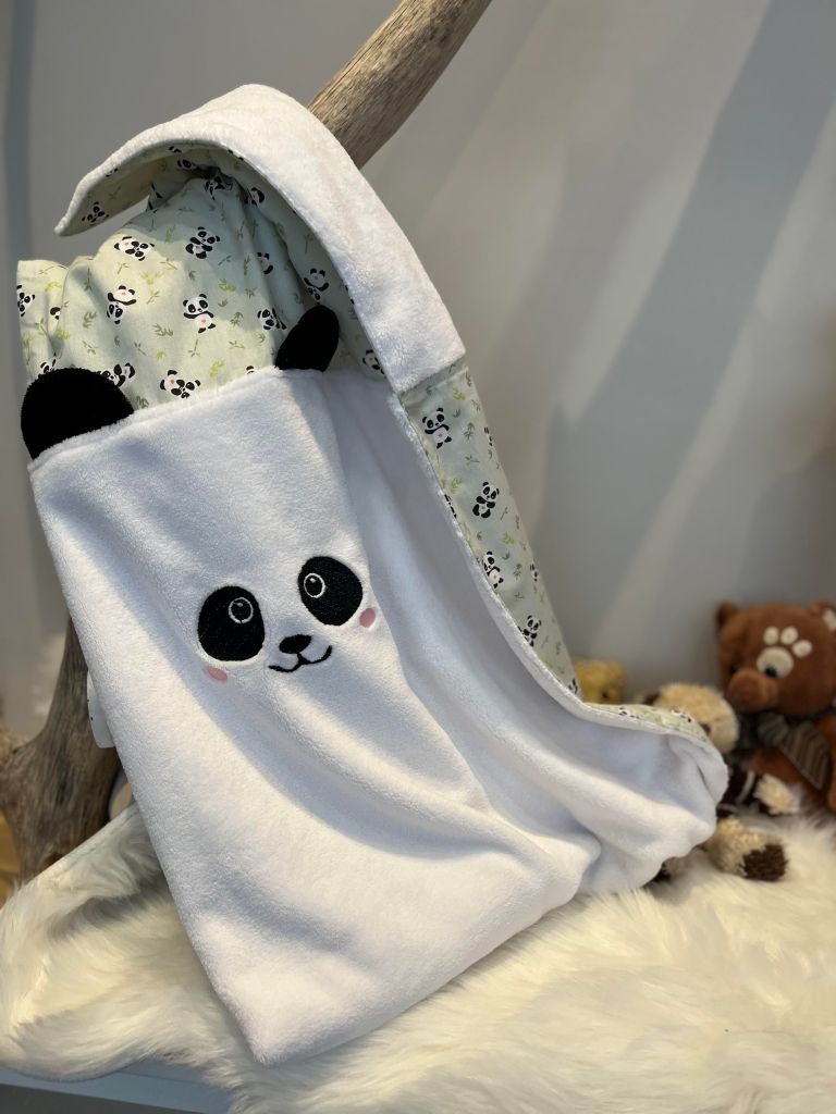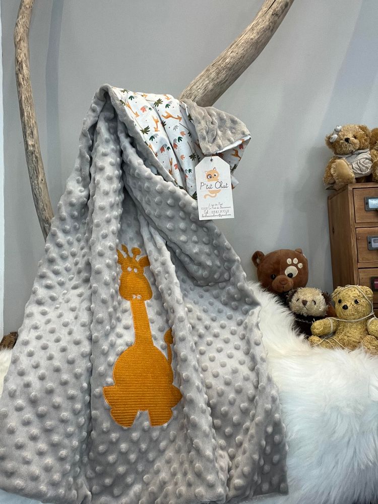 Confection en coton imprimé et minky, doudou ou gaze de coton selon le thème choisi par les parents.