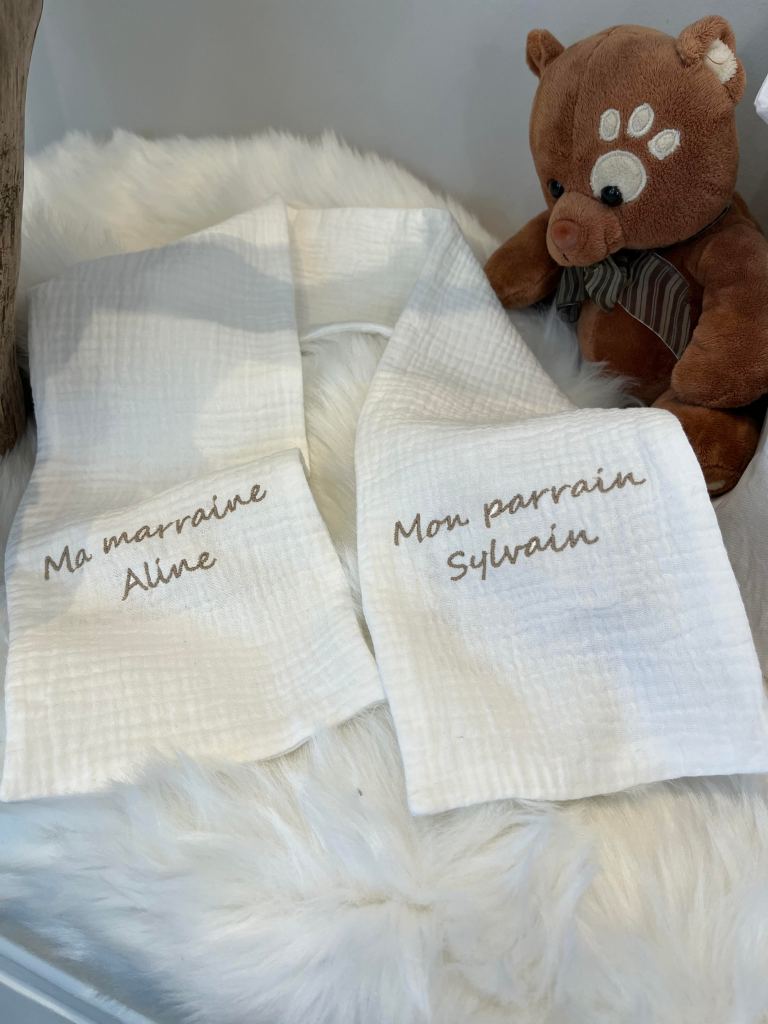 Broderies : Prénom + date + motif + parrain + marraine – Coton : 40.00€ / Double gaze : 42.00€