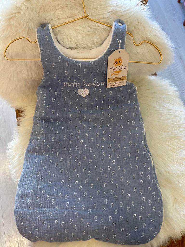 Confection en coton imprimé ou gaze de coton et doudou ou légère en double gaze de coton et nid d’abeille, selon le thème choisi par les parents.